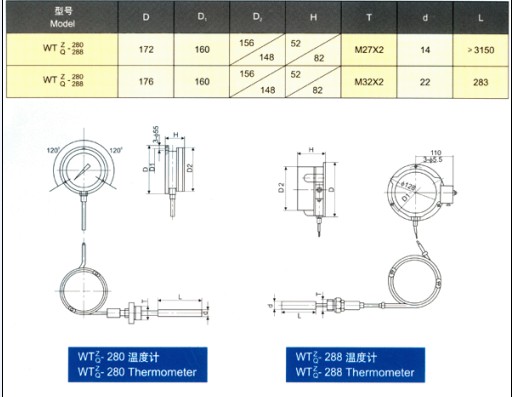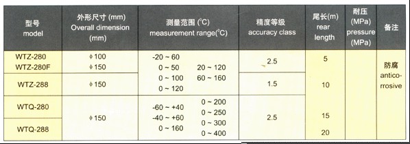 壓力式溫度計 一、用途及特點 WTZ/WTQ-280/288系列壓力式溫度計該型號壓力式溫度計適用于過程中較遠距離的非腐蝕性液體或氣體的測量,電接點型壓力式溫度計能在工作溫度達到和超過給定值